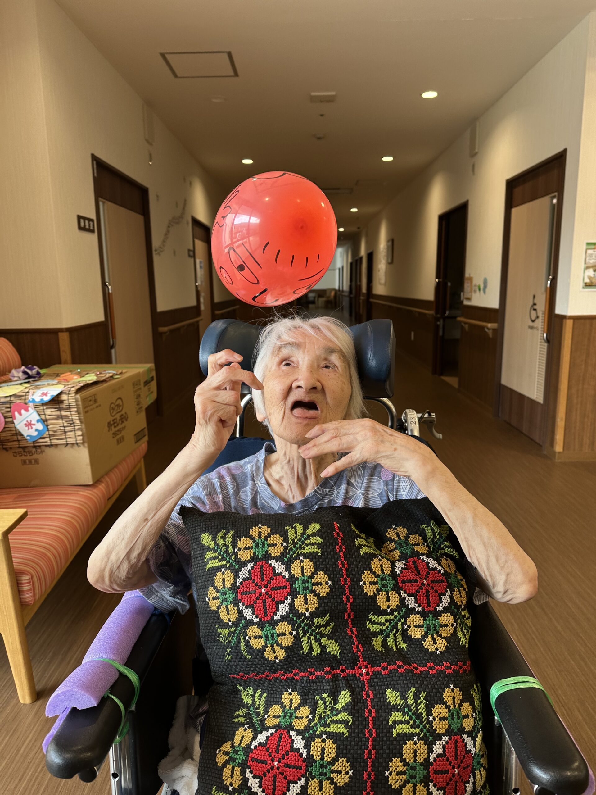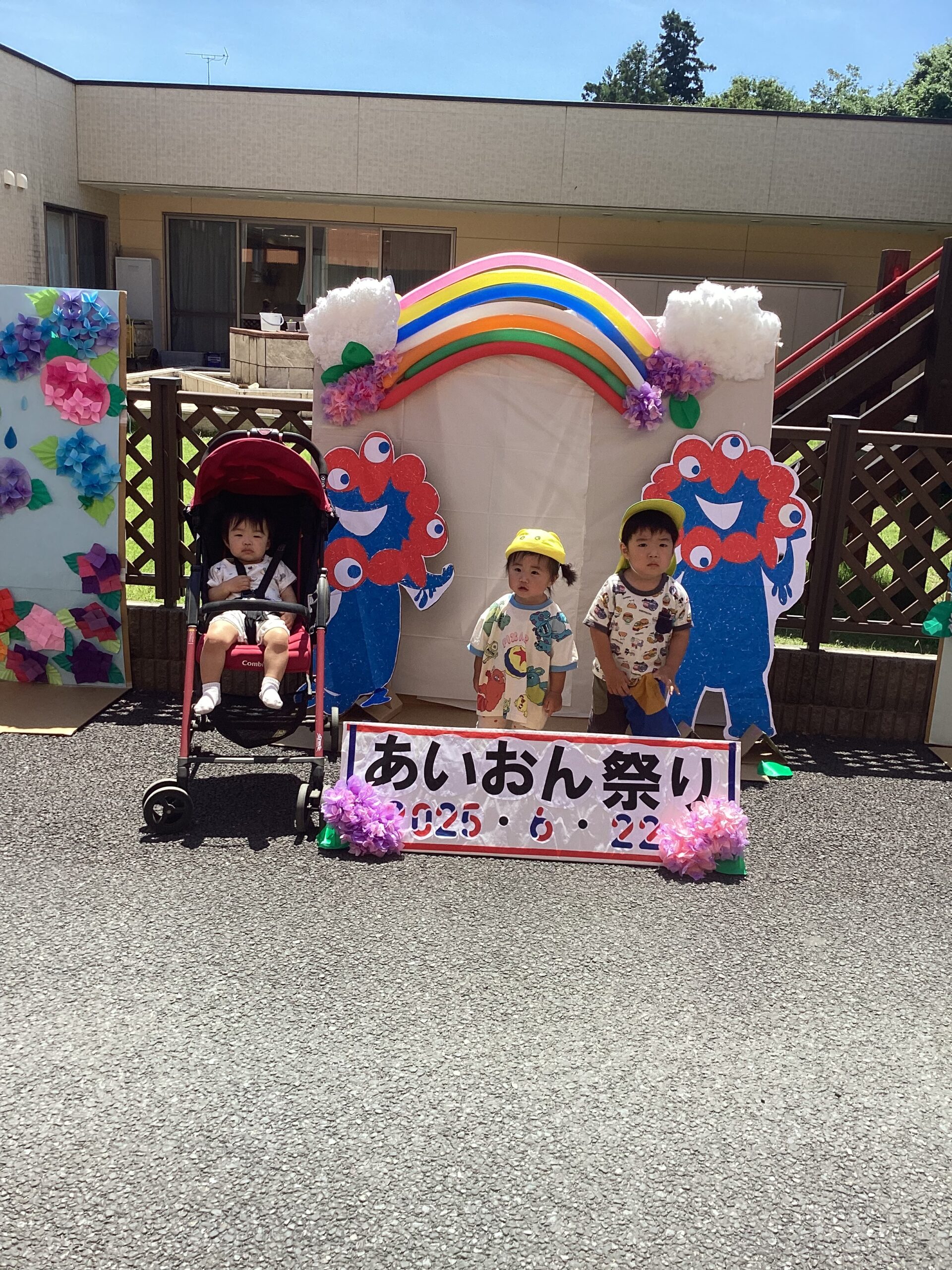 施設のお祭り、あいおん祭りに参加しました! フォトコーナーで記念写真を「パチリ」 私たち保育士もあじさいに見立てた傘で踊り、場を盛り上げました!
